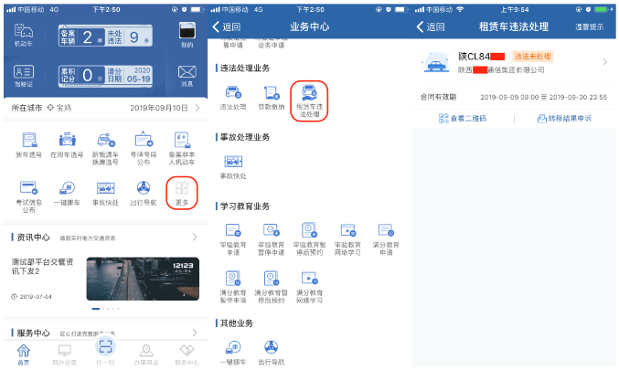 承租驾驶人登录“交管12123”APP后,点击【租赁车违法处理】功能,进入租赁车交通违法处理流程。选择租赁合同,可以查询、处理租赁合同期间的交通违法记录。