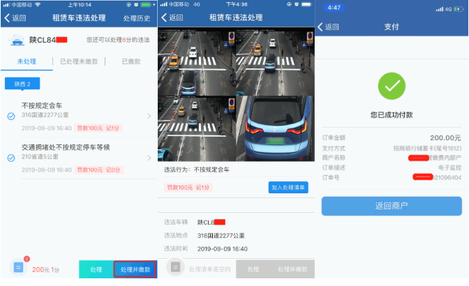 点击交通违法记录可以查看交通违法详细信息及证据照片等信息。选择需要处理的交通违法记录,点击【处理并缴款】,可网上直接处理并缴纳罚款。