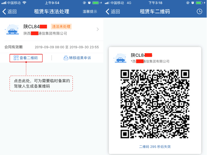 承租驾驶人点击【租赁车违法处理】,选择租赁合同,点击【查看二维码】后,可亮出二维码提供其他驾驶人扫码备案。