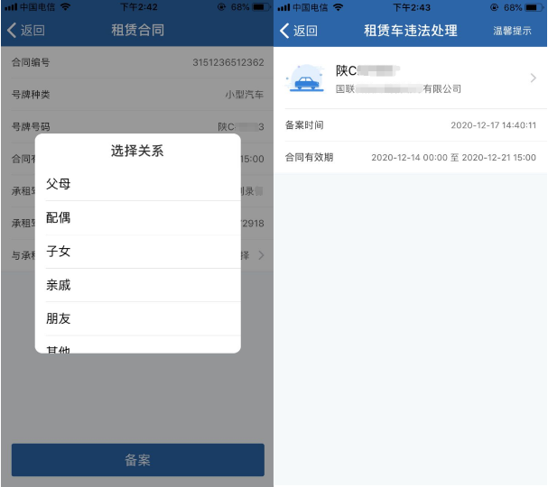 除承租驾驶人,还允许2个驾驶人通过“交管12123”APP临时备案租赁车。临时备案成功后,驾驶人可以通过“交管12123”APP查询租赁合同期间的交通违法记录,并可以处理备案后至租赁合同期限届满发生的交通违法。