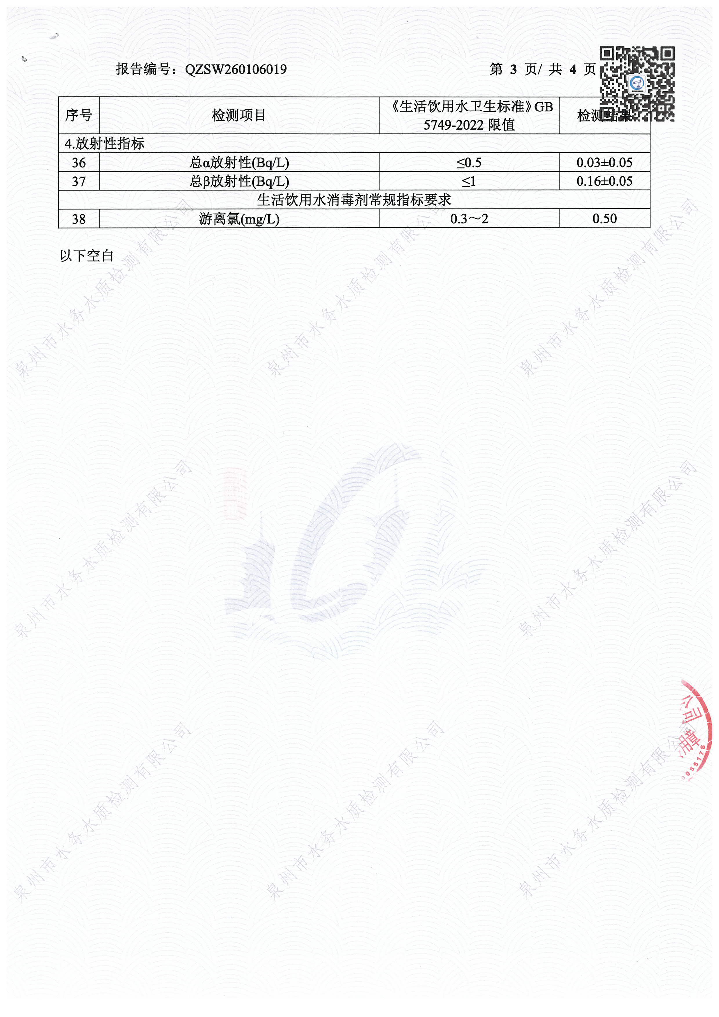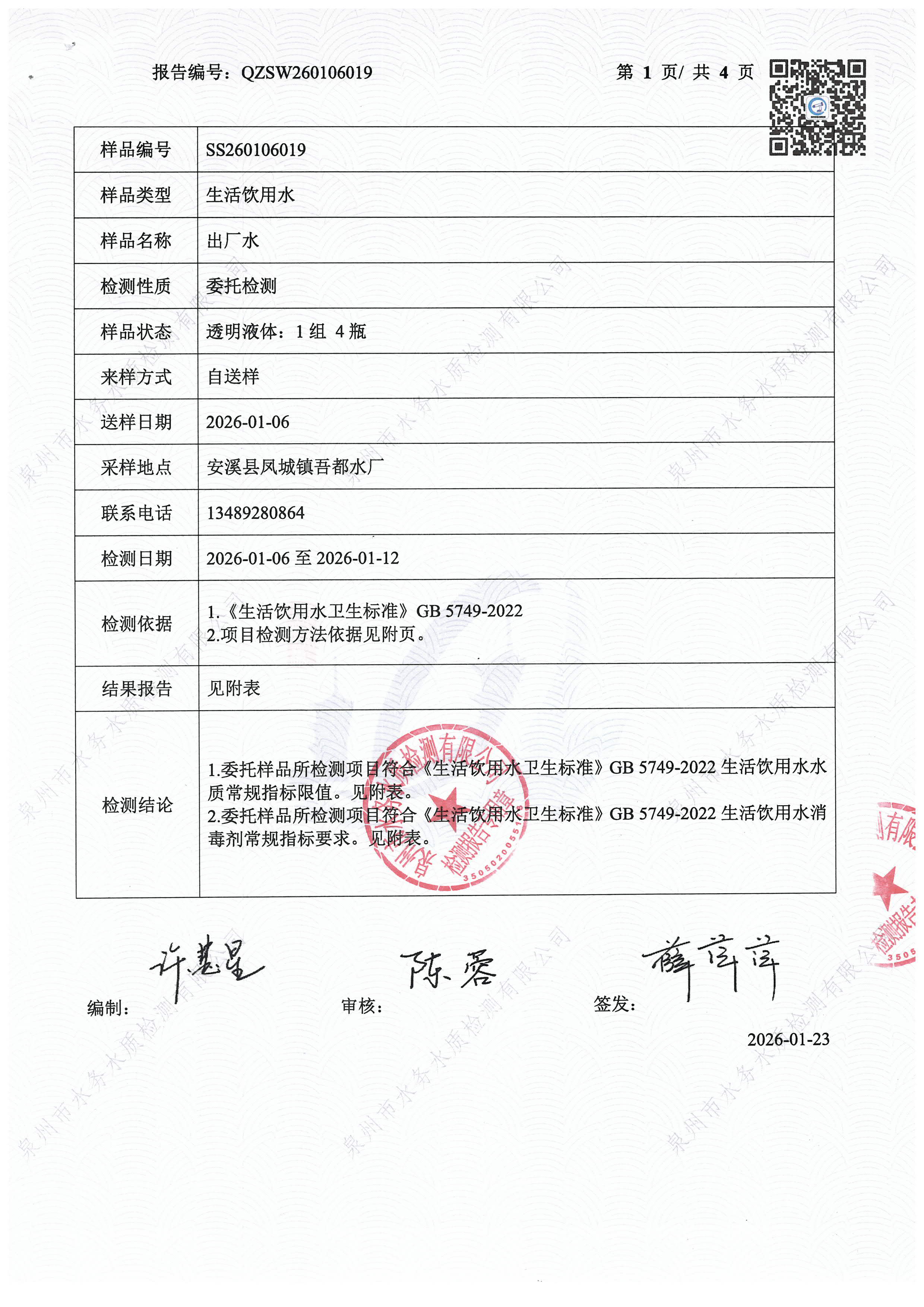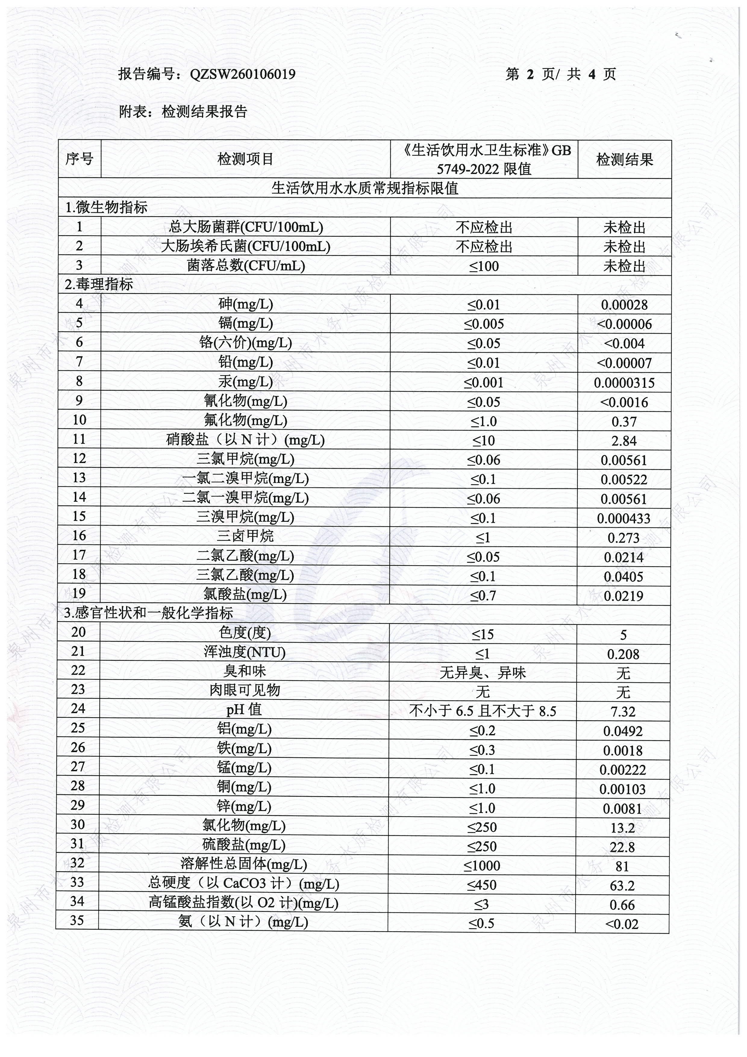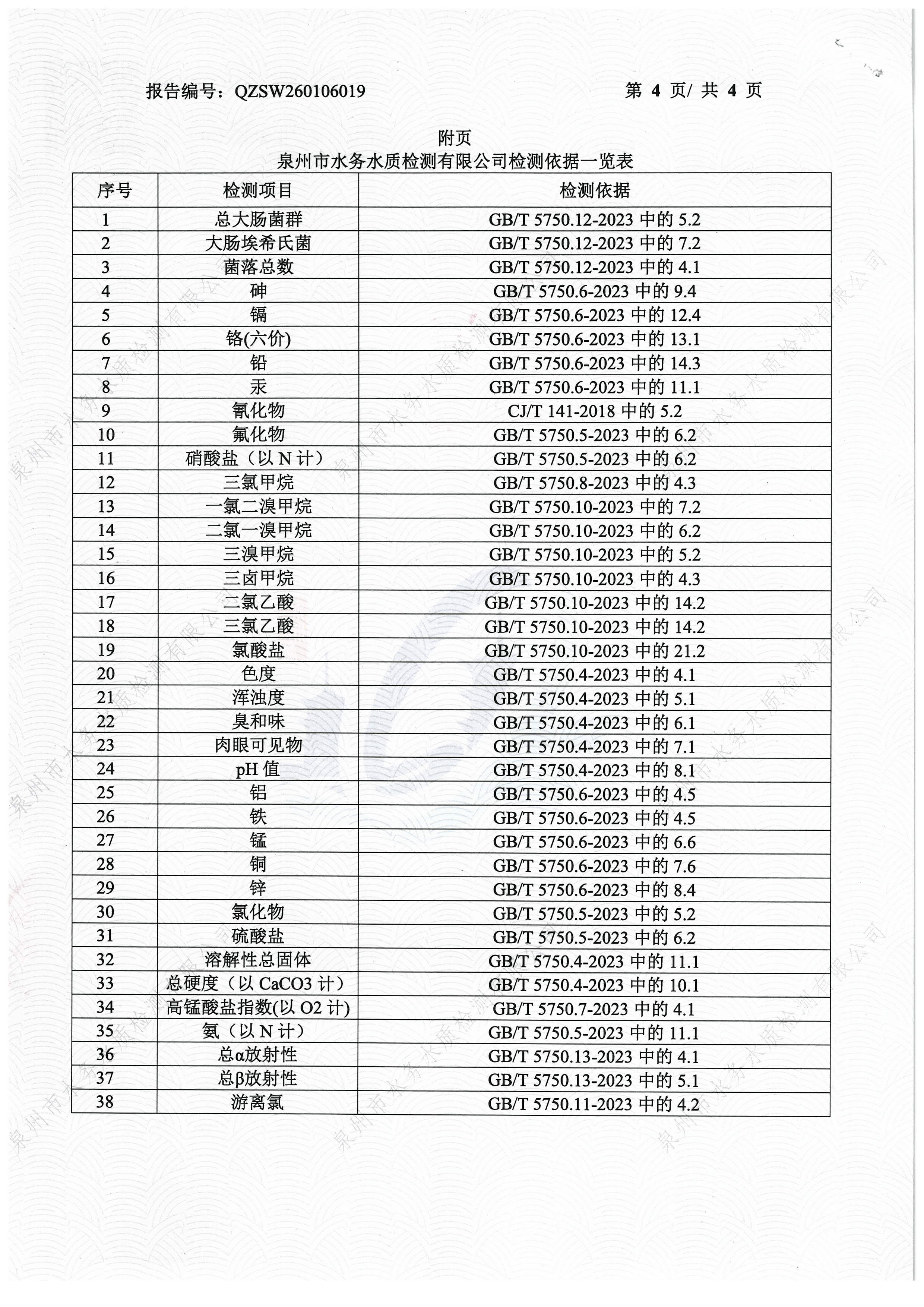 2026年01月出厂水送泉州水质站43项检验报告
