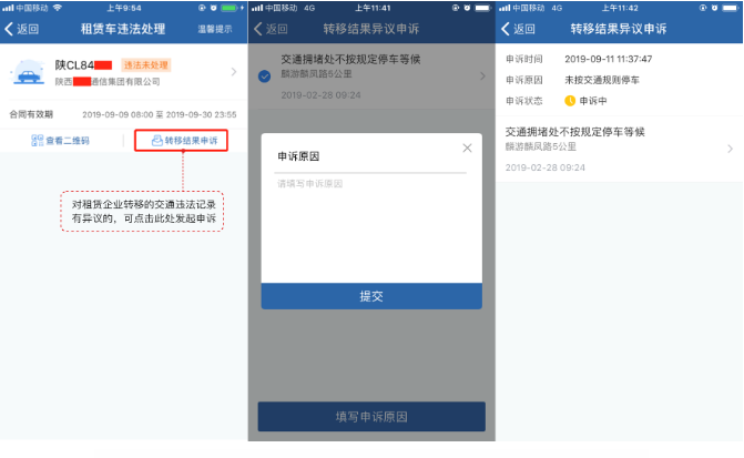 承租驾驶人点击【租赁车违法处理】功能,选择【转移结果申诉】按钮进入申诉界面。选择申诉的交通违法记录,采集申诉原因,提交申诉。