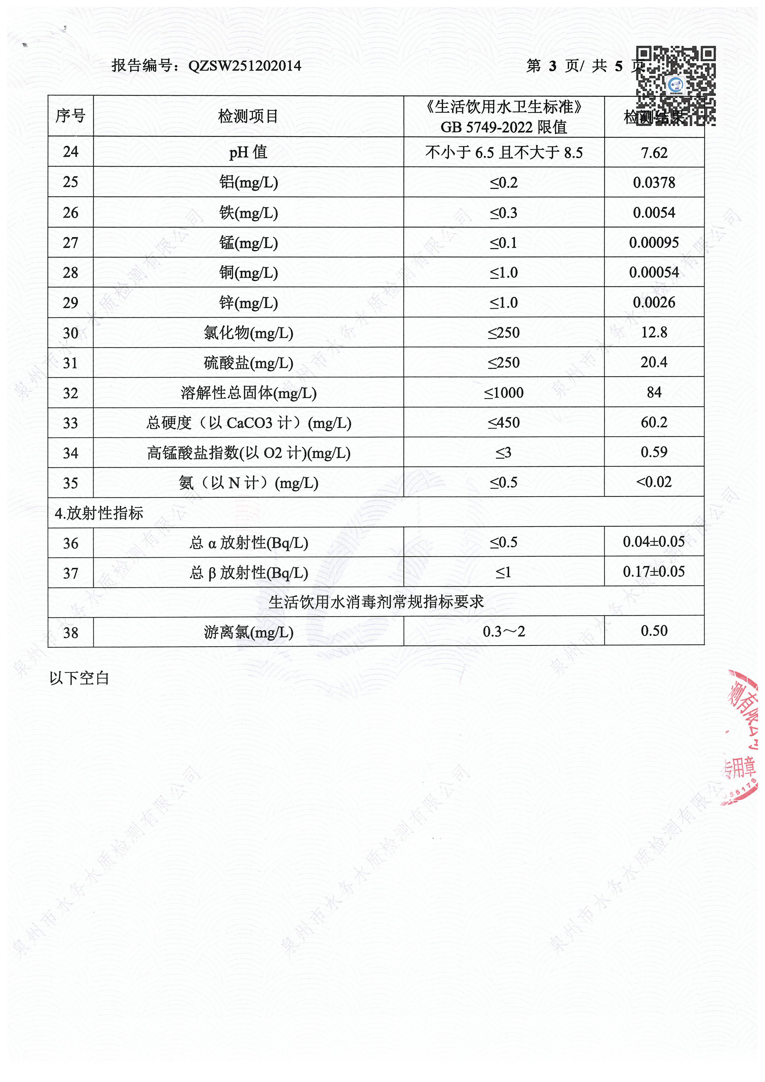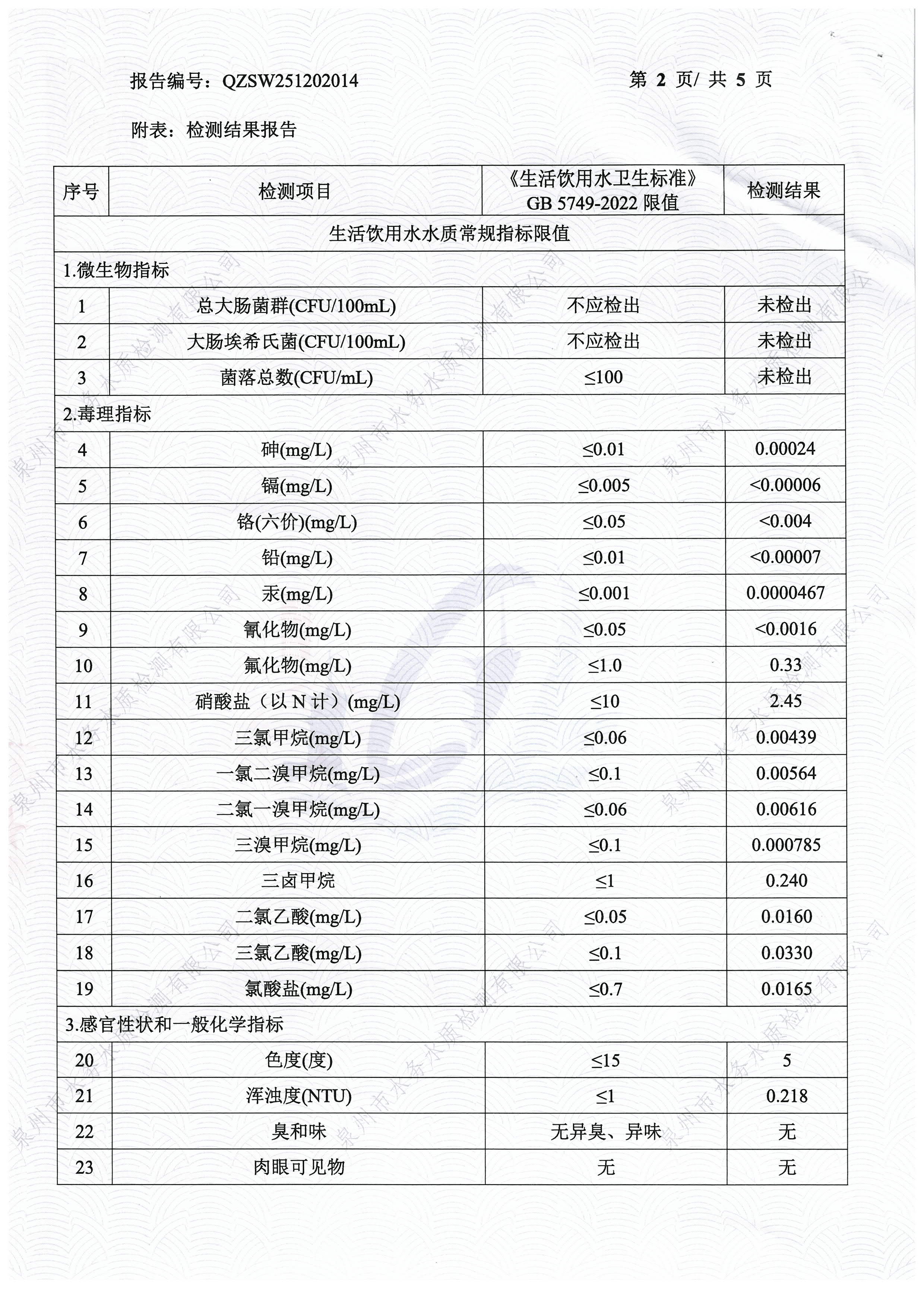 2025年12月出厂水送泉州水质站43项检验报告