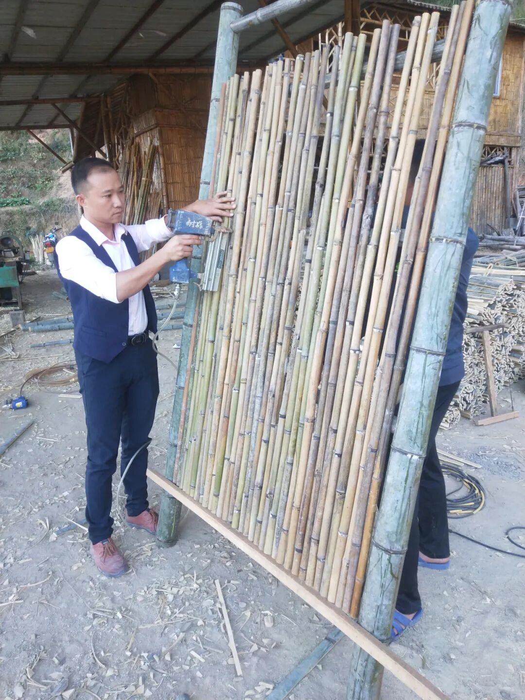 山内寨村是安溪县蓝田乡西南部的小山村,地处蓝田乡政府驻地南14.3公里,地处深山,远离市集,人口仅600多人。“来蓝田,我‘氧’你”。这句话已成为蓝田乡山内寨村村民对外宣传的口头语。这里,长满了青翠的竹子,漫山遍野,遮天蔽日,茫茫2000多亩,宛若烟波浩渺的绿色海洋,是人们向往的天然氧吧。这里,有着几百年来,祖辈们传下来的编篾技艺,人们编织农具,换取生活所需。这里,有着一名守着大山,下定决心带领乡亲们发展竹产业的共产党员,他就是在山内寨村土生土长的竹艺人才——富山阁竹业专业合作社理事长颜章智。