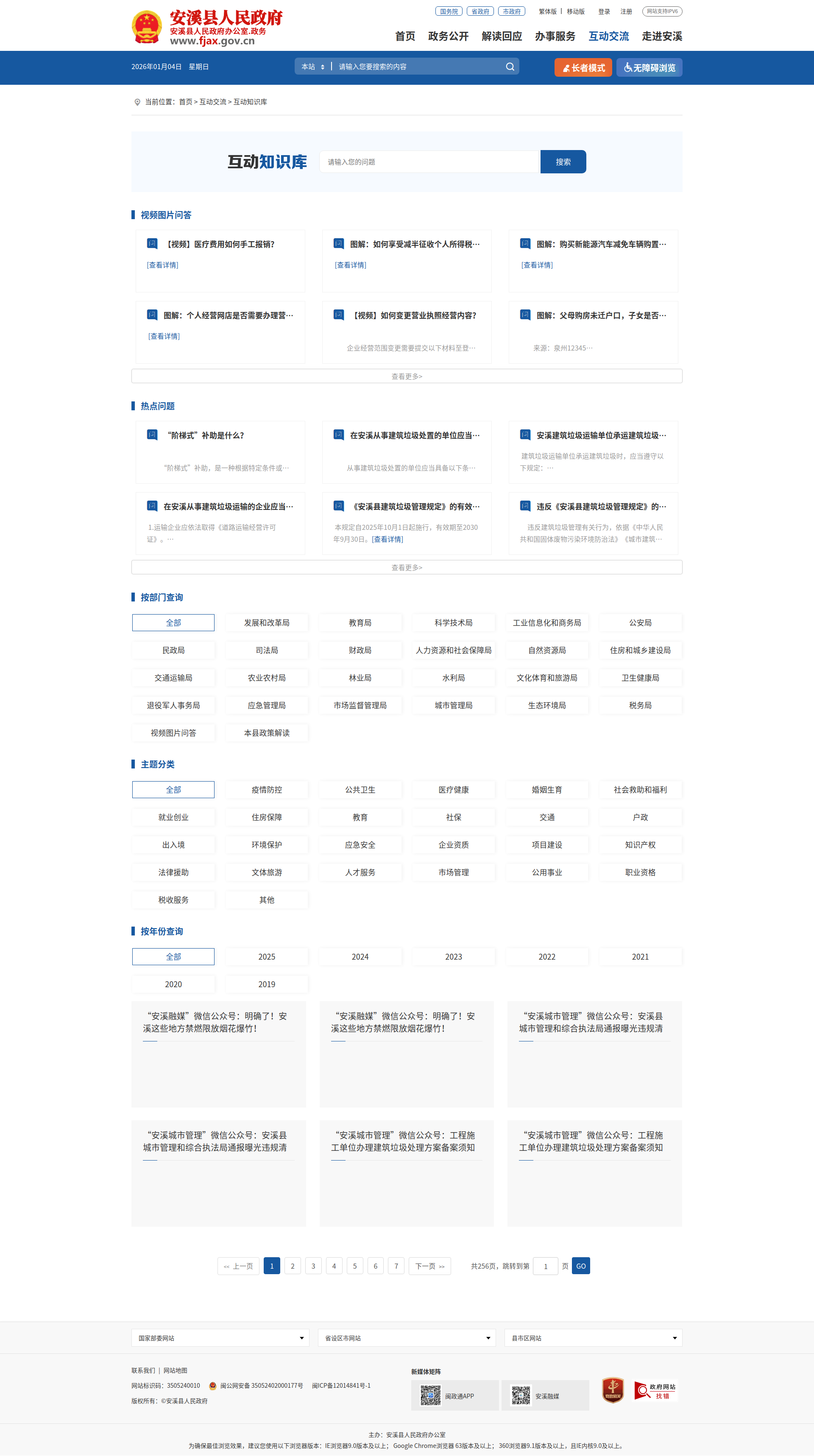 4.政府信息公开平台建设方面。安溪县政府网站在提供政务信息的同时,加强县长信箱、在线访谈、咨询投诉、网上调查、民意征集等政民互动,提高政府工作的公信力、影响力、凝聚力。开设“互动知识库”“政策文件库”等专栏,及时了解民众需求,密切政府和人民群众联系,为公众提供快捷、精准高效的搜索问答服务和咨询业务办理的便利服务。2025,收到并处理县长信箱93件,开展在线访谈4次、民意征集33次、网上调查1次,及时规范办理12345便民服务平台咨询投诉26420件,发布政策咨询问答信息987条。