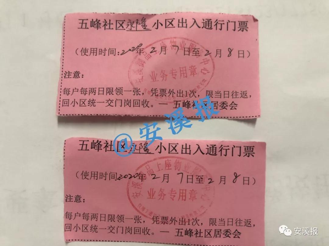 根据要求,2月7日起,五峰社区辖区内各个小区实行凭票出入,每户每两日限领一张,限一人出行,当日返回。业主(包括车辆)出行前需凭身份证到出入岗登记领票,并妥善保管,凭票返回小区并上交。