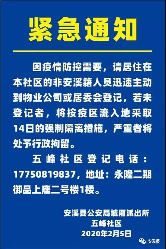2月6日,我县发布了10条最严防控措施(点击:刚刚,安溪出台10条最严防控措施!),明确要求全县所有村(社区)、单位一律实行封闭式管理或半封闭式管理,人员进出一律测体温。严控外来人员和车辆,非本村(社区)人员一律劝返,如遇特殊情况做好备案登记。