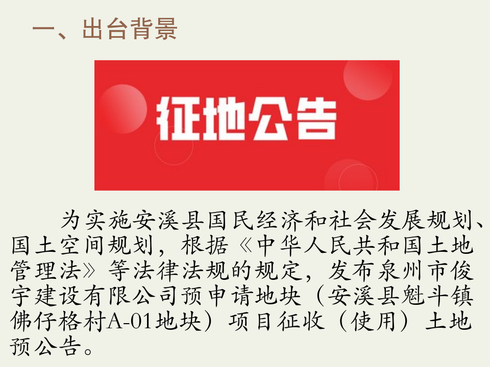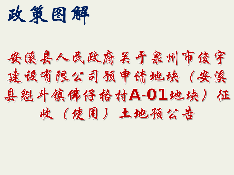 政策图解:安溪县人民政府关于泉州市俊宇建设有限公司预申请地块(安溪县魁斗镇佛仔格村A-01地块)征收(使用)土地预公告