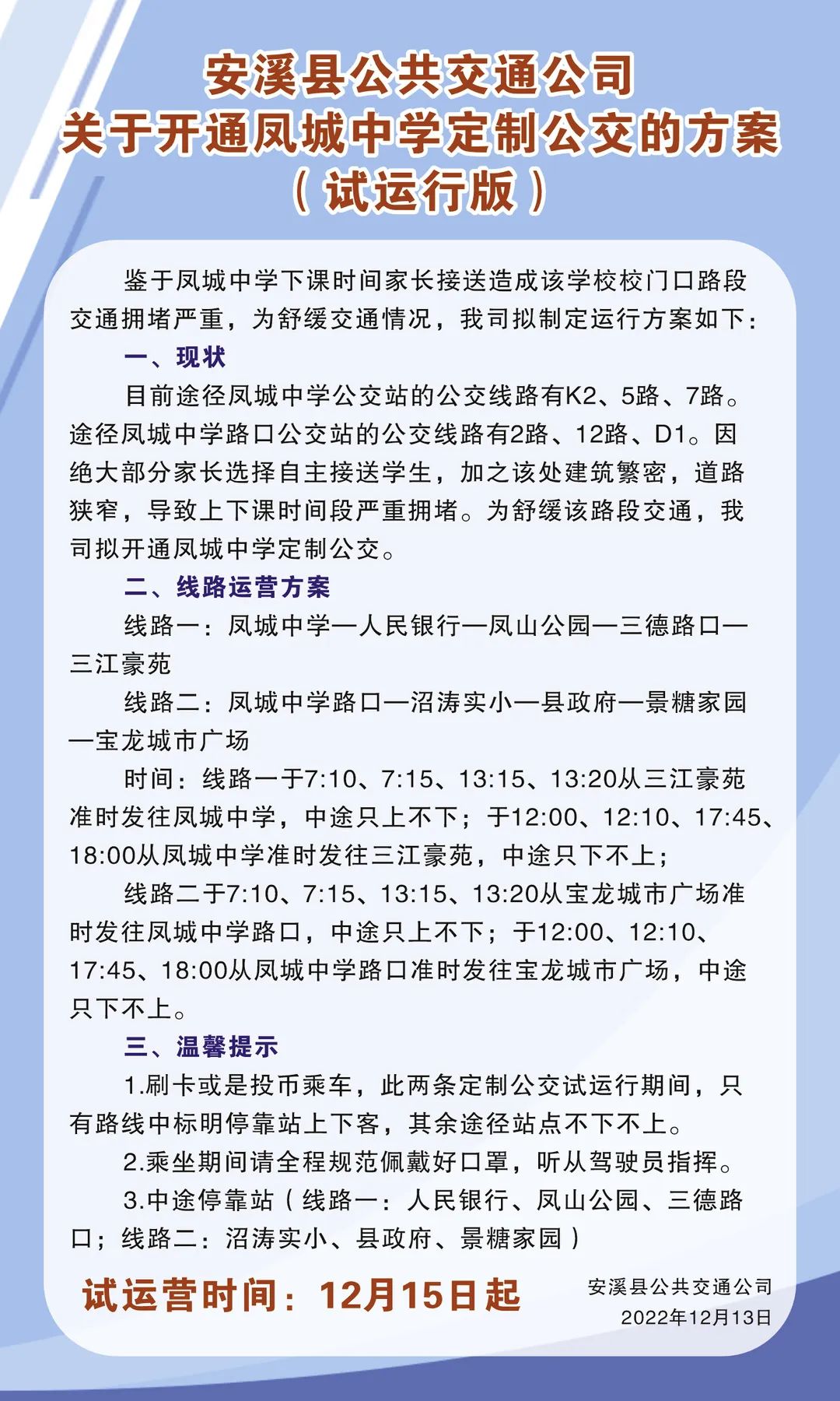 安溪县公共交通公司关于开通凤城中学定制公交的方案(试运行版)