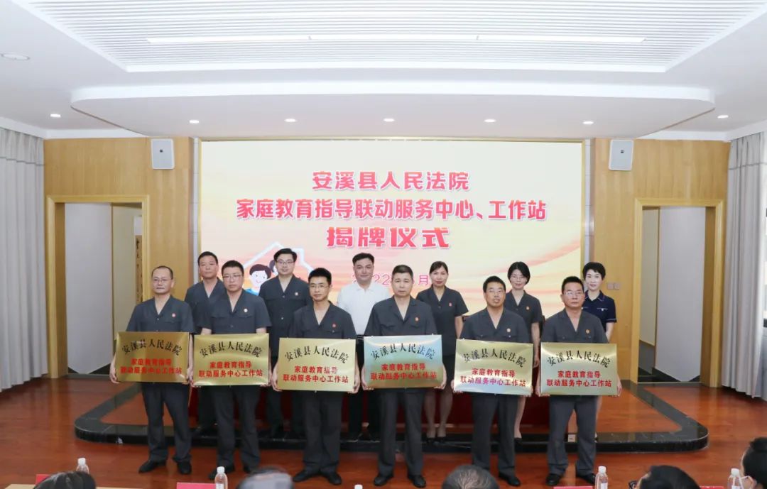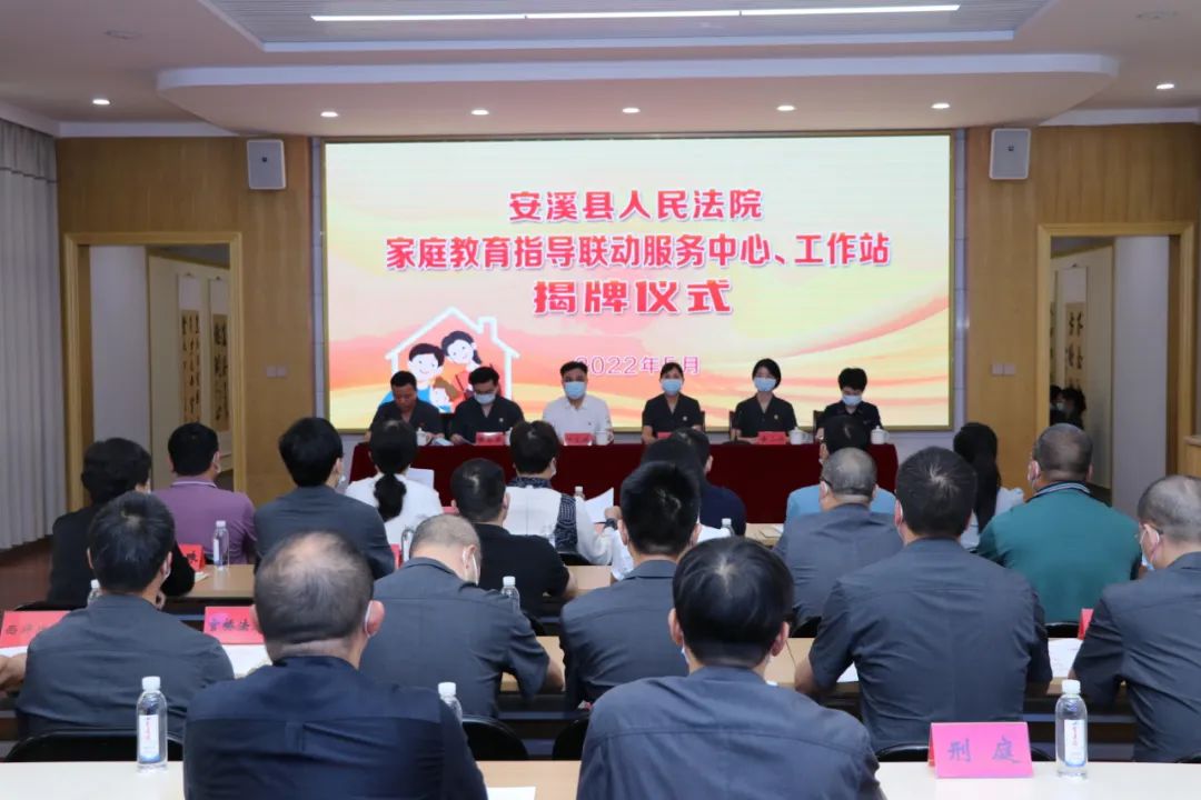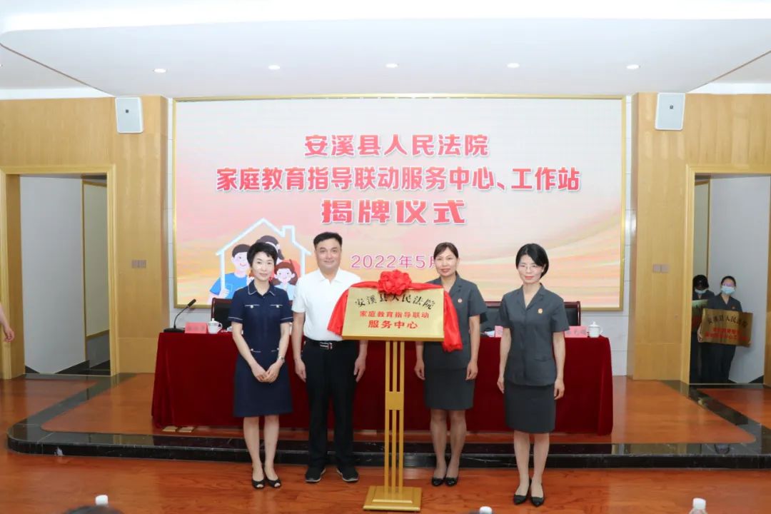 (为发挥基层法庭贴近基层、贴近群众的优势,打通家庭教育指导最后一公里,构建覆盖城乡家庭教育指导服务体系,同步在安溪法院六个基层法庭设立家庭教育指导联动服务工作站。主席台领导共同为工作站授牌)