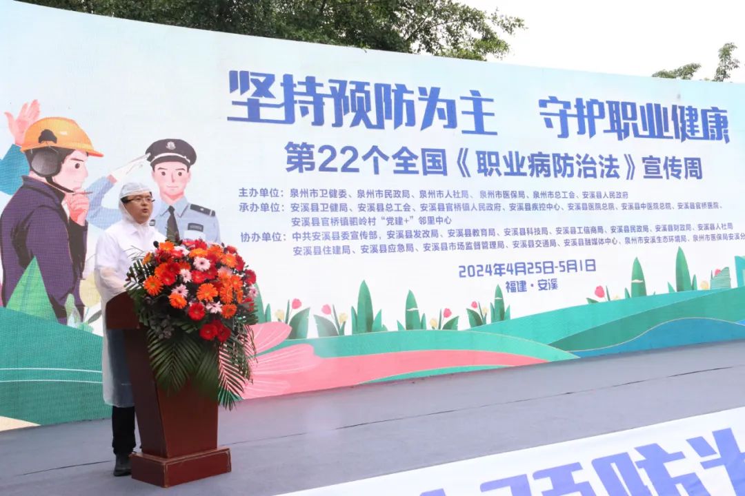 2024年4月25日至5月1日是第22个全国《中华人民共和国职业病防治法》宣传周,今年活动的主题是:“坚持预防为主,守护职业健康”。为进一步推动落实用人单位职业病防治主体责任,提升劳动者职业健康素养水平,切实保障广大劳动者职业健康权益,4月25日上午,泉州市《中华人民共和国职业病防治法》宣传周启动仪式在安溪县官桥镇驷岭村“党建+”邻里中心举行。