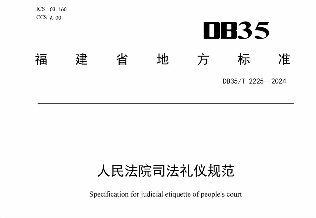 福建省市场监督管理局批准发布《人民法院司法礼仪规范》省级地方标准。该标准在基层试点基础上,广泛收集全国各地司法礼仪的先进经验和做法,充分征求省委政法委、省检察院、省司法厅、律师协会、高等院校以及社会各界的意见和建议,是全国首个规范人民法院司法礼仪的省级地方标准。